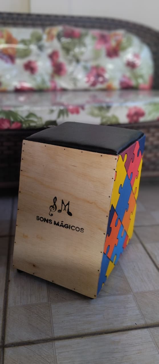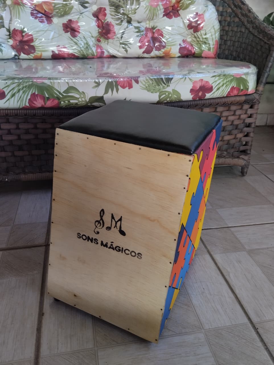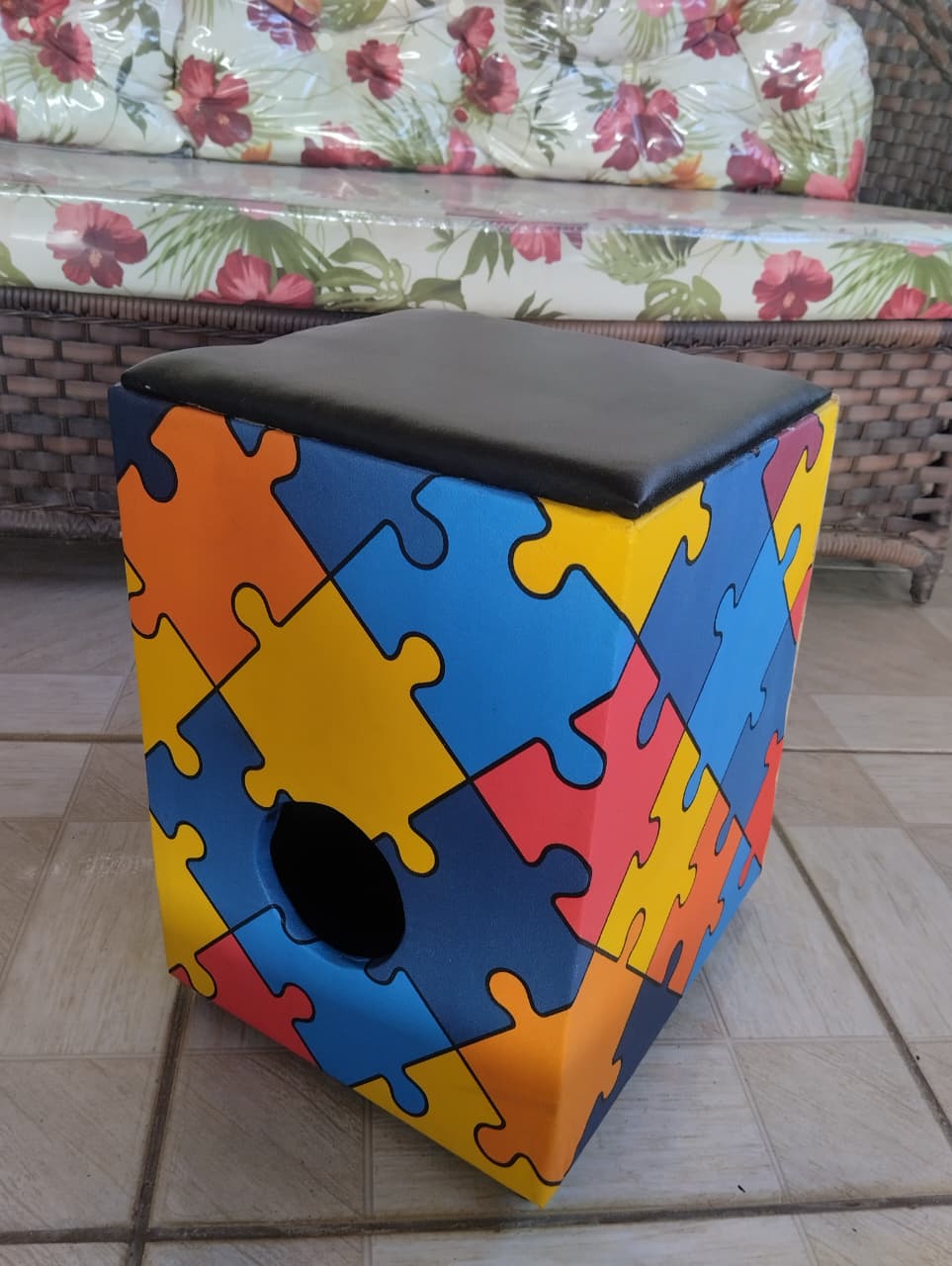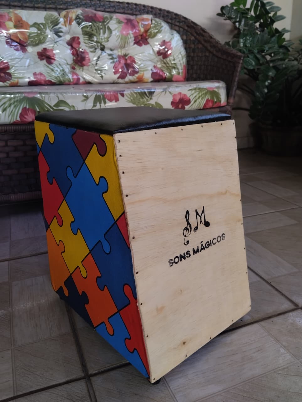 Cajon é a bateria do percussionista. Hoje é um dos instrumentos mais utilizados nas apresentações de pequenos grupos musicais. O nosso Cajon é feito com esteira de caixa. Assento de espuma e acolchoado com courino preto. Corpo feito de madeira e acabamento (forrado) com napa com o tema do autismo. Instrumento feito sob encomenda.
